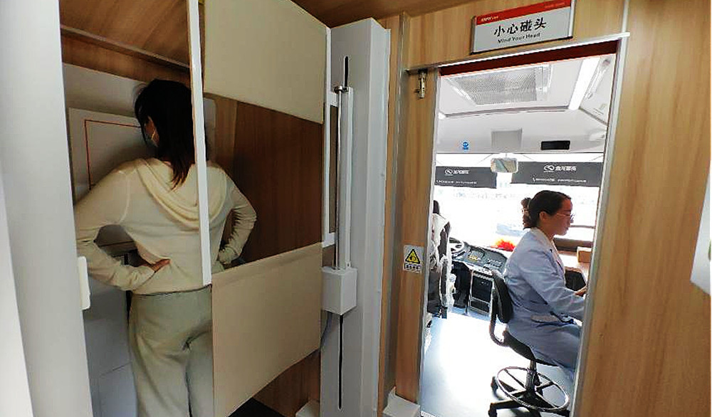 記者登上移動體檢車發(fā)現(xiàn),車內干凈整潔,溫度適中,根據(jù)不同的體測項目,體檢車分為B超區(qū)、心電圖區(qū)、放射區(qū)、電測聽區(qū)、肺功能及婦科檢查等檢測區(qū)域,功能檢查及基礎健康檢查設備分類設置,一應俱全,可同時進行5大項20多個小項的檢查,實實在在為企業(yè)員工提供便捷的健康體檢服務。